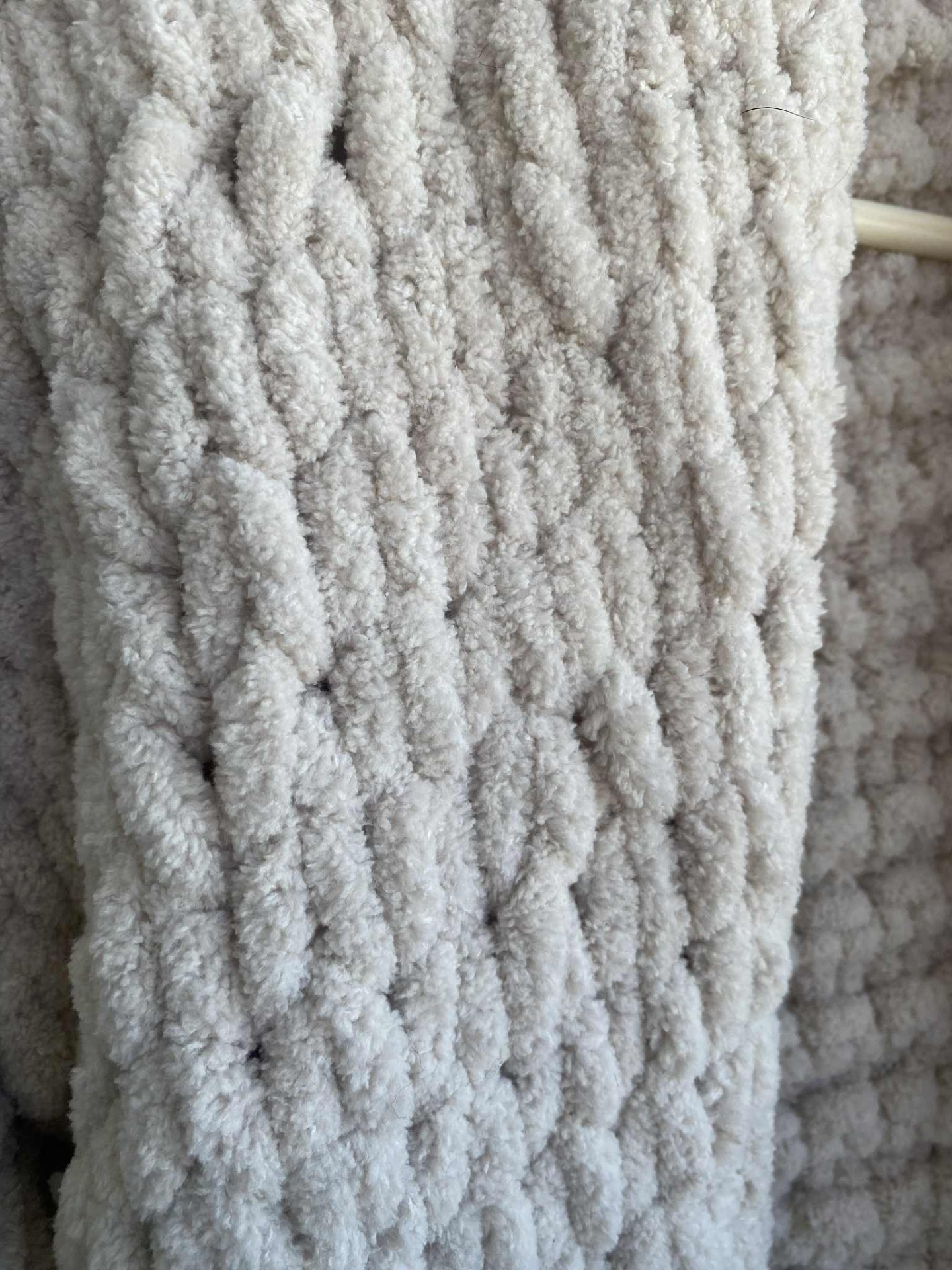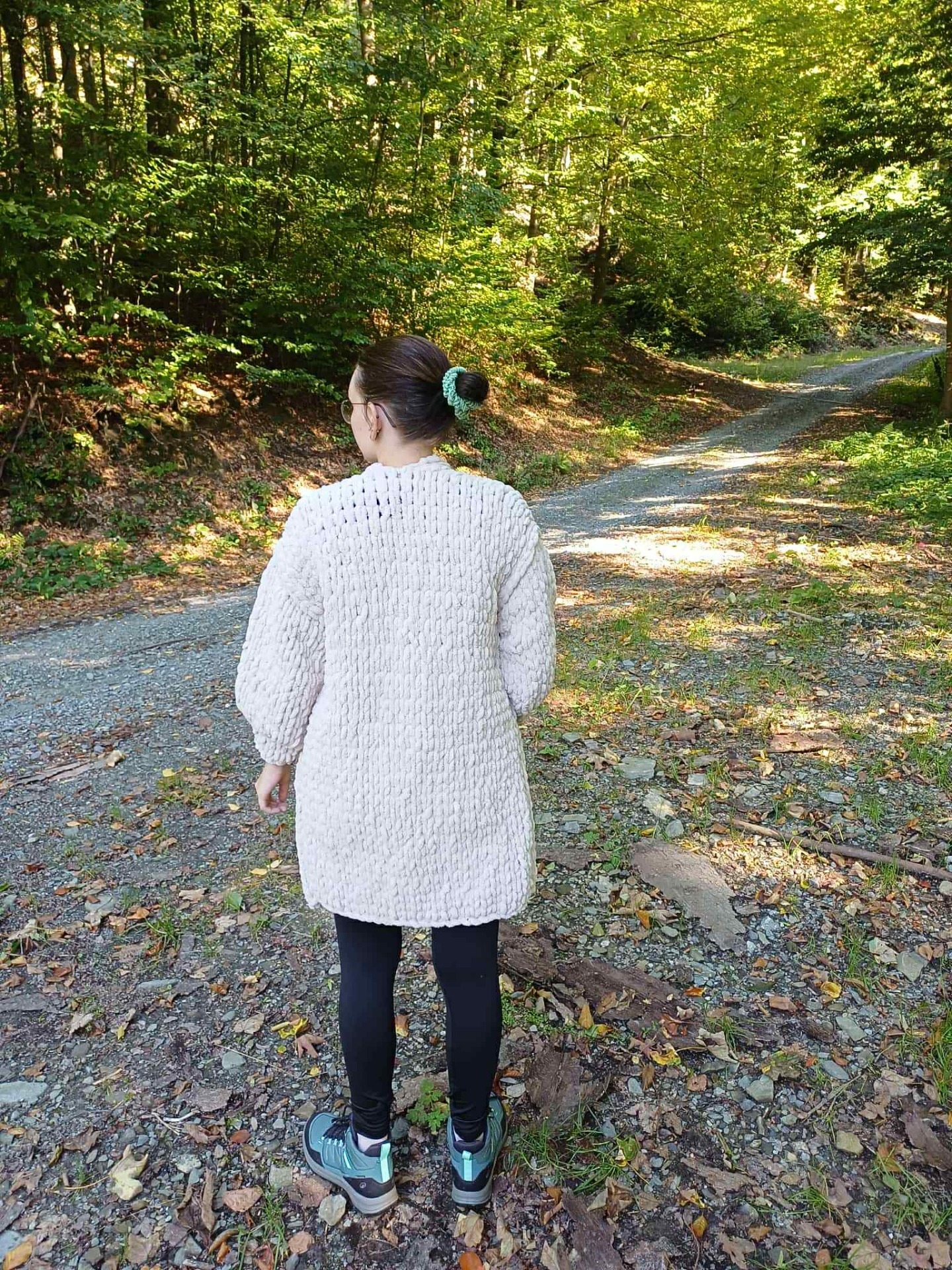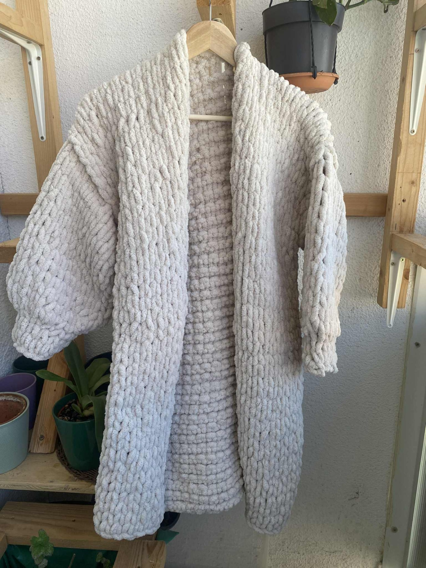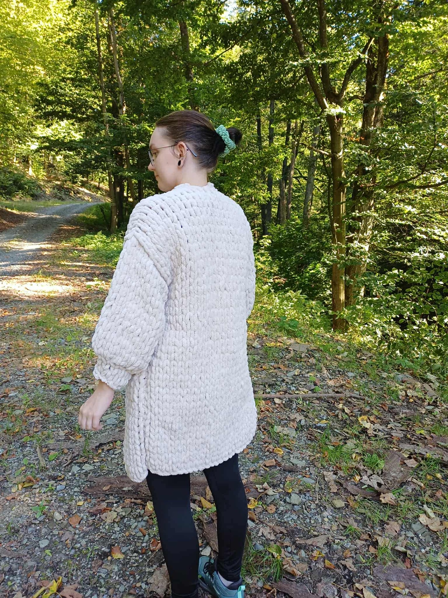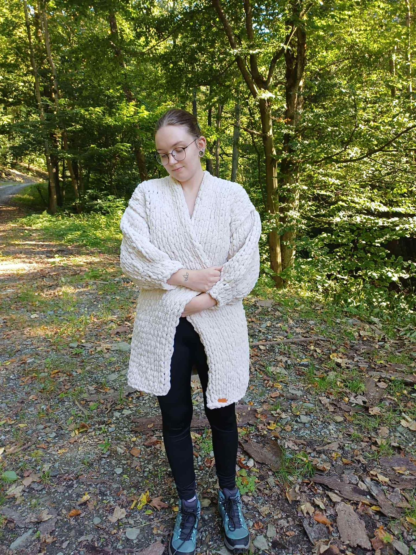 Ručně pletený kabátek Cloudy Hug je synonymem pohodlí a měkkosti. Vyrobený z nadýchané žinylkové příze v jemném krémovém odstínu působí hřejivě a elegantně zároveň. Jeho volný střih se snadno kombinuje s domácím outfitem i s ležérní módou na ven, takže se stane vaším oblíbeným společníkem pro chladnější dny. Kabátek je ideální pro ty, kdo ocení ruční práci a chtějí se cítit doslova jako v objetí obláčku.