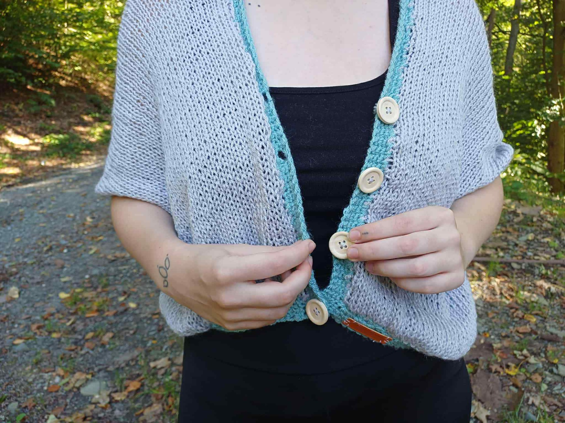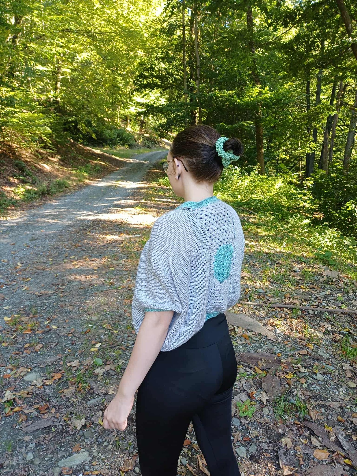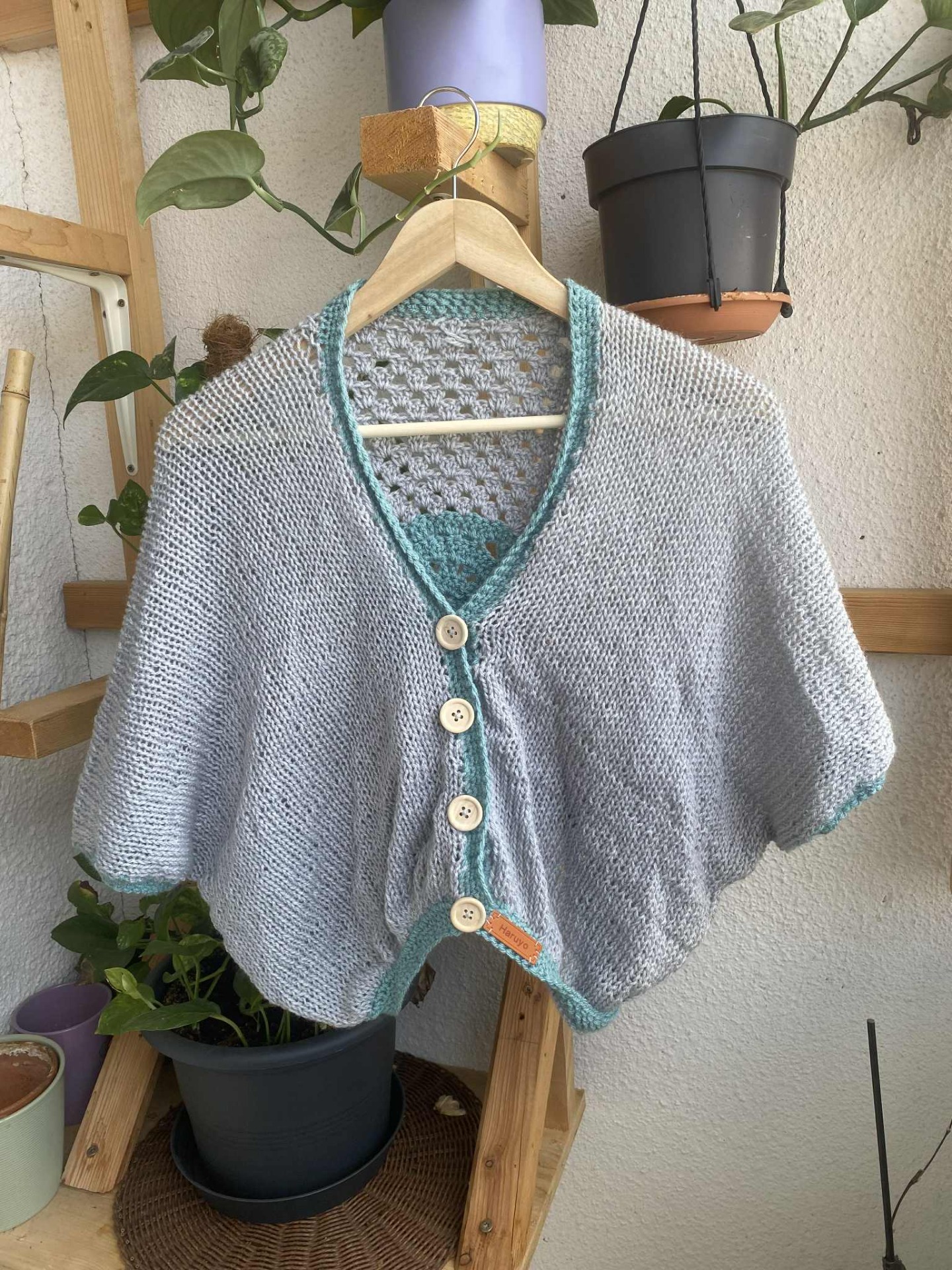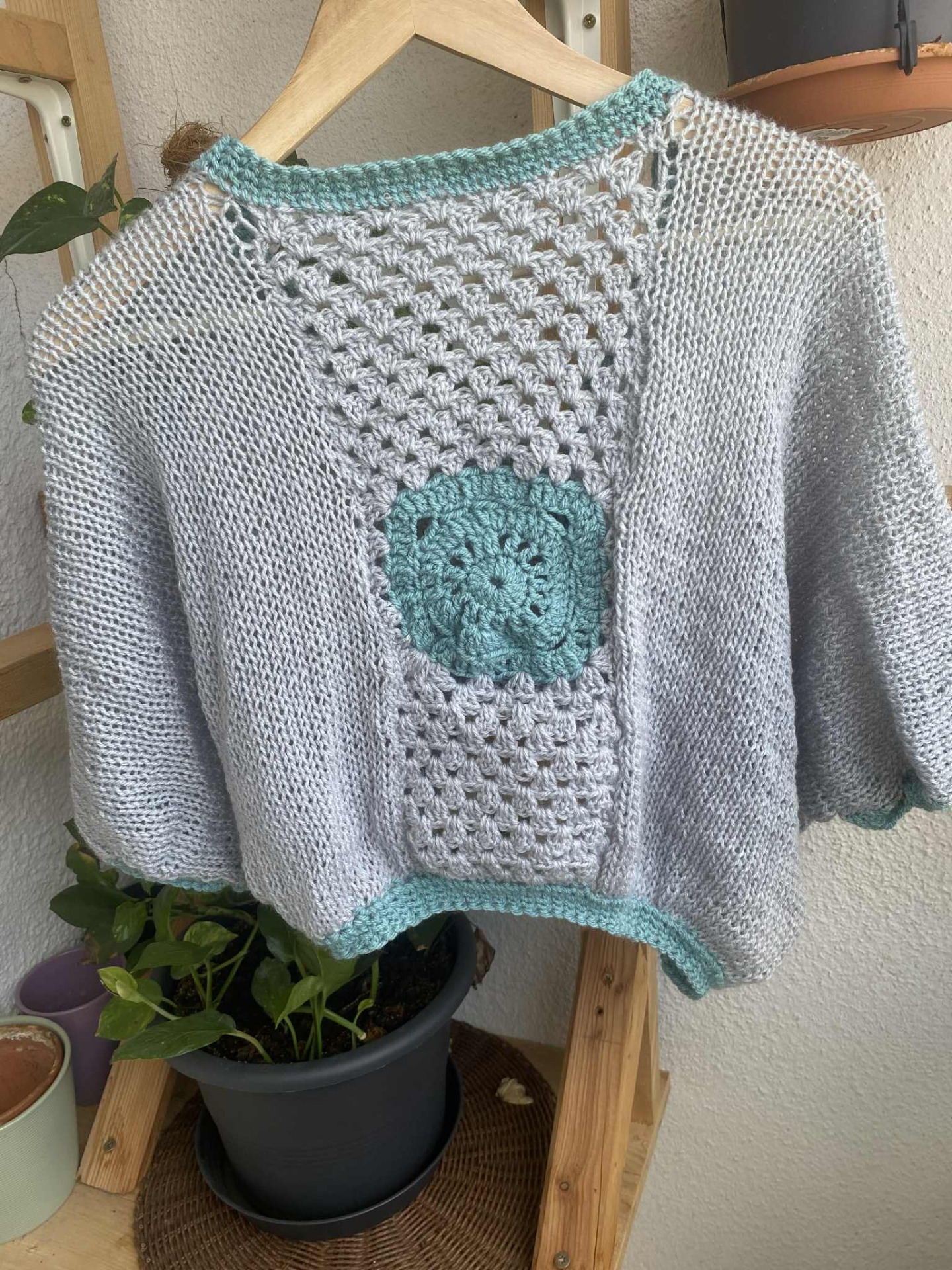 Originální kousek z mé dílny, pletený z jemné příze v šedém odstínu s tyrkysovým lemováním. Na zadním díle je háčkovaný vzdušný vzor, který dodává svetříku jedinečný vzhled. Díky volnému střihu se pohodlně nosí, krásně padne přes tričko, šaty i rolák a hodí se jak do chladnějších letních večerů, tak i do podzimu.
