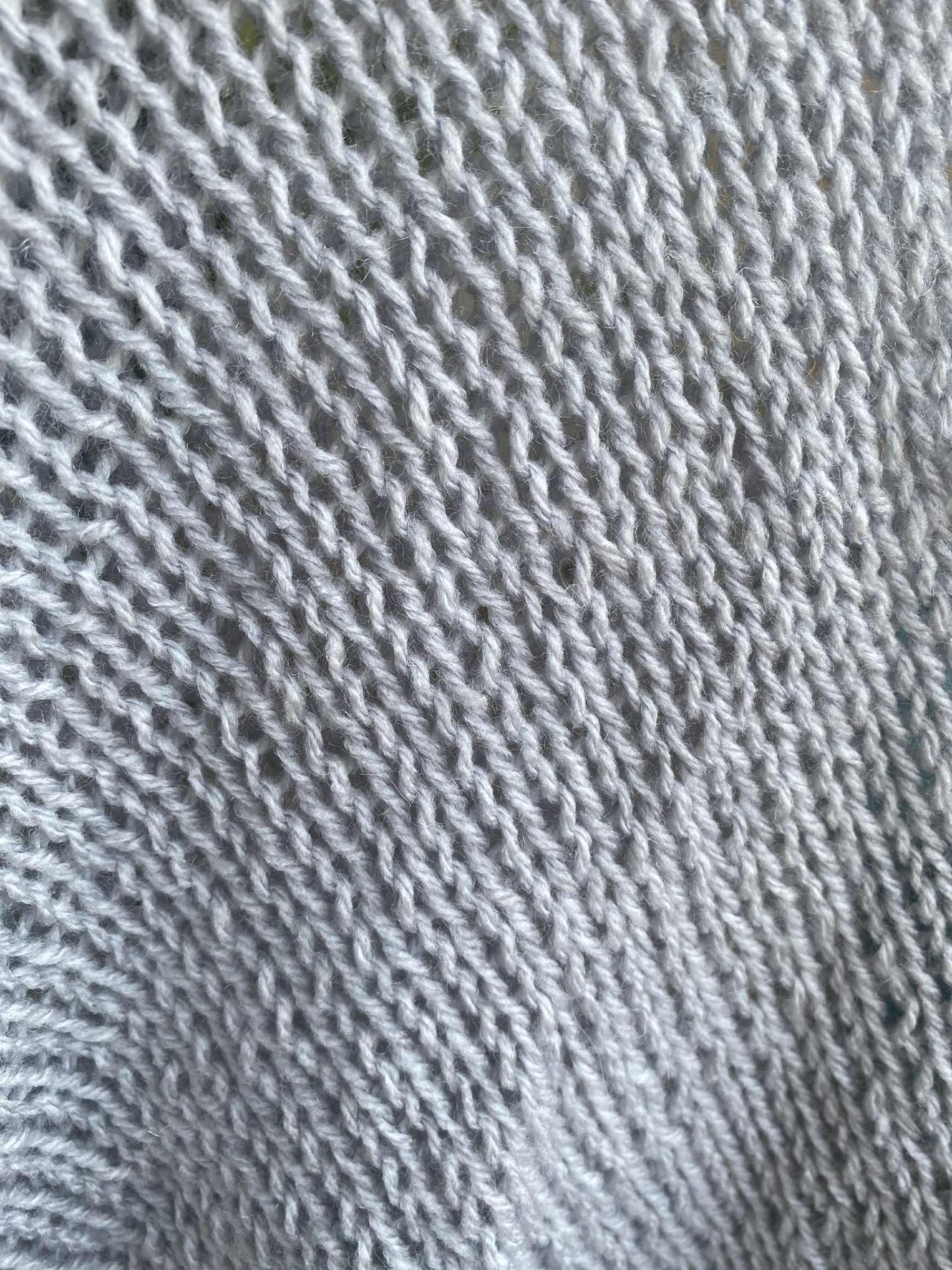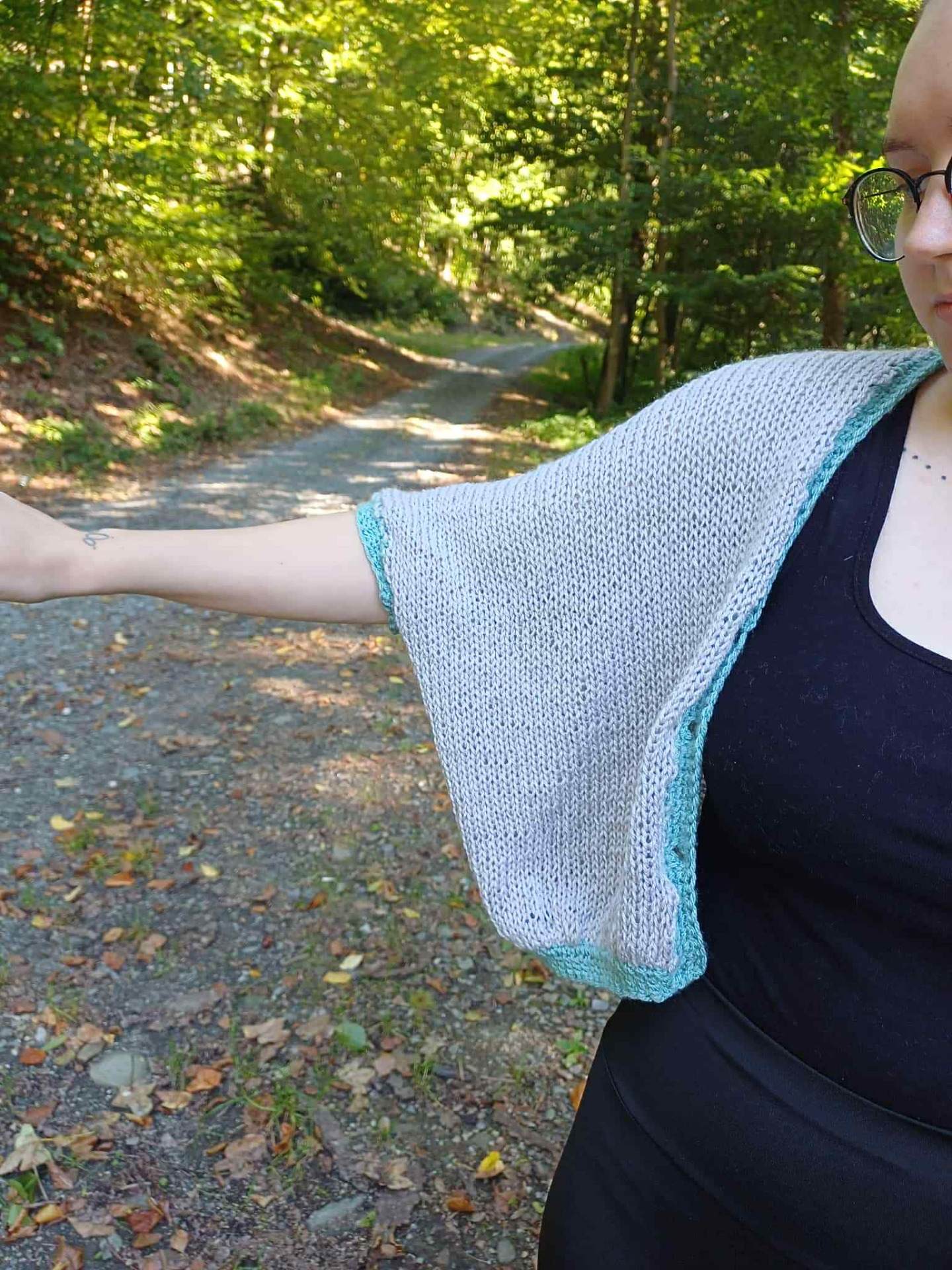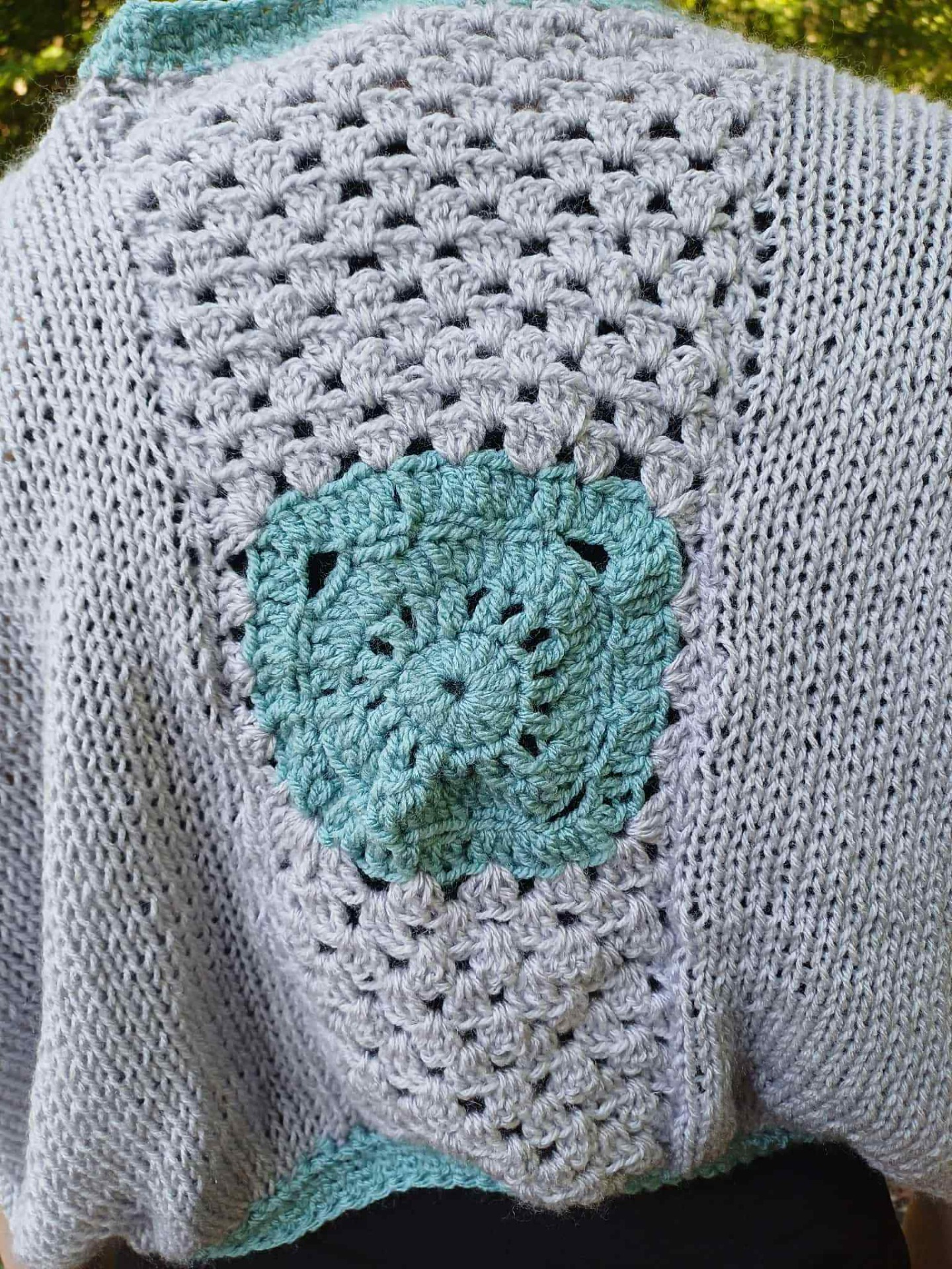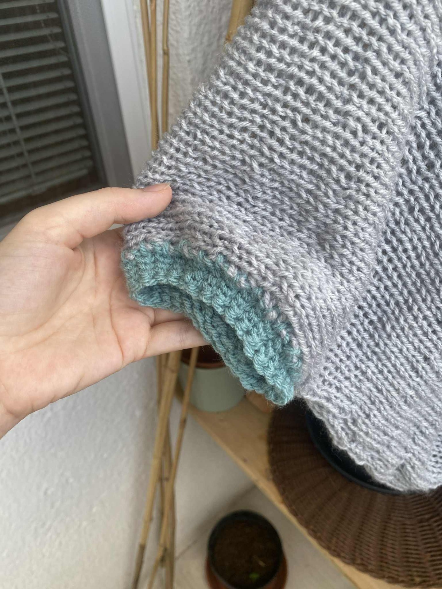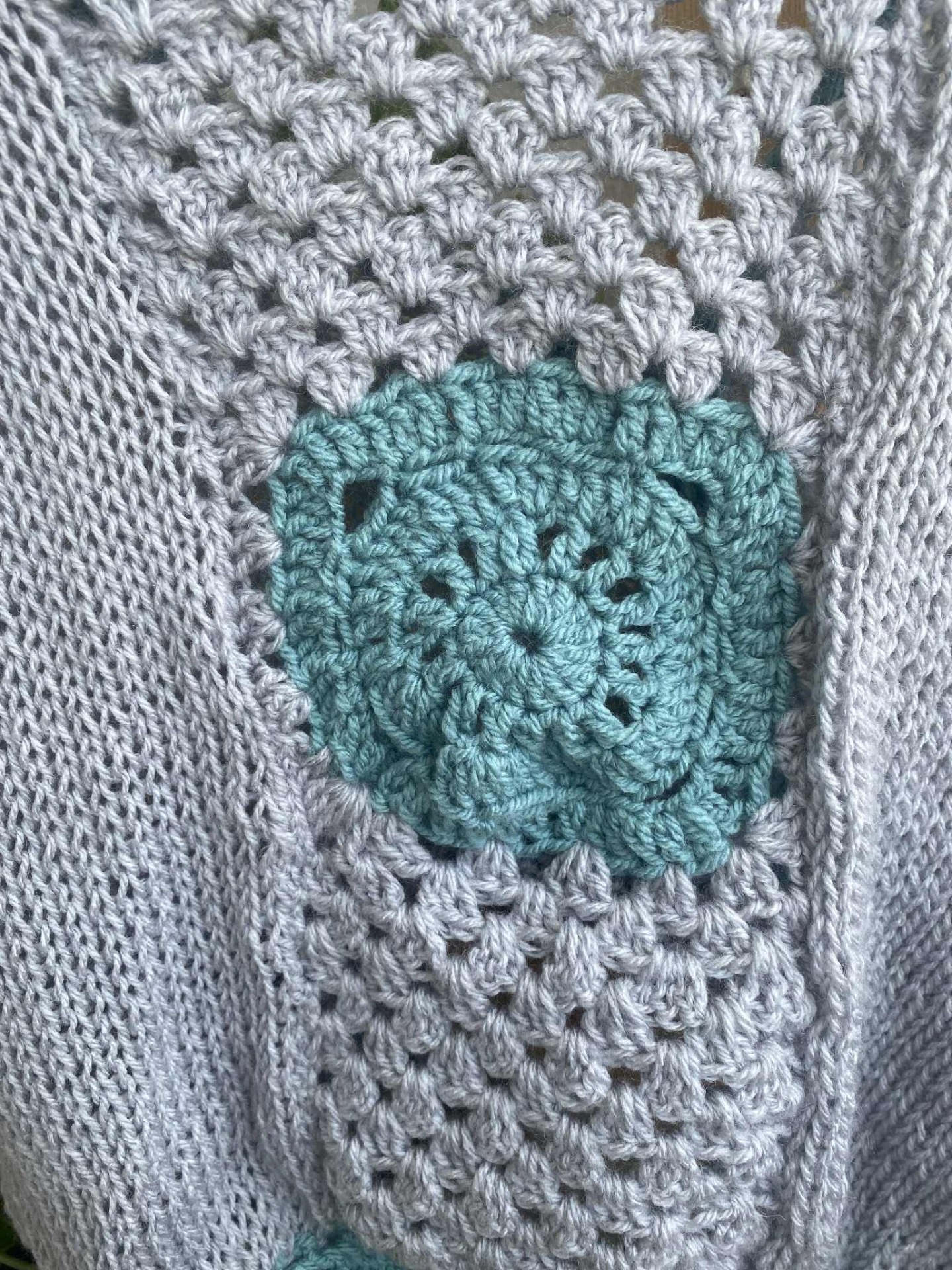Originální kousek z mé dílny, pletený z jemné příze v šedém odstínu s tyrkysovým lemováním. Na zadním díle je háčkovaný vzdušný vzor, který dodává svetříku jedinečný vzhled. Díky volnému střihu se pohodlně nosí, krásně padne přes tričko, šaty i rolák a hodí se jak do chladnějších letních večerů, tak i do podzimu.